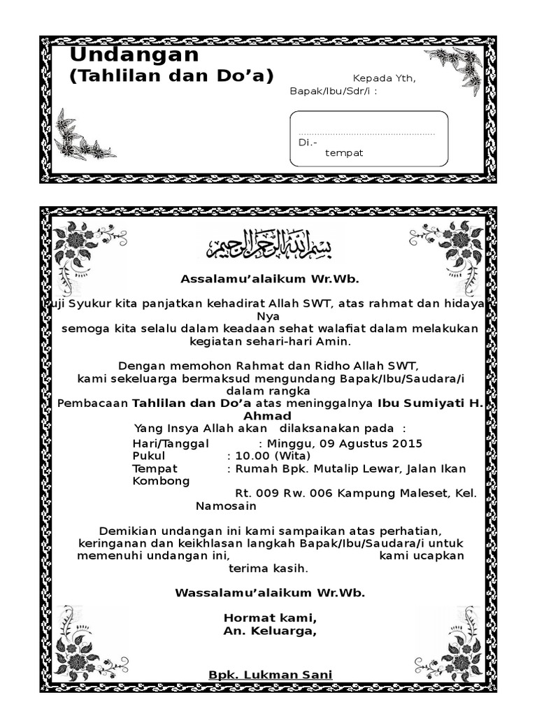 Di artikel sebelumnya kami sudah membuat undangan tahlil satu lembar isi 2, namun untuk mempersingkat waktu anda tidak perlu membuatnya dari awal, cukup mendownload filenya saja, kemudian edit sesuaikan dengan data yang bersangkutan seperti nama dan tempat serta kapan acara tersebut akan dilaksanakan, untuk caranya sendiri cukup mudah namun yang rumit. Cara membuat undangan tahlil dengan microsoft word, mudah dan … Bentuknya simple, bisa kamu print di kertas a4 sekalipun. Kertas ukuran f4 (hvs)112403902 contoh undangan walimatul ursy 1 lembar isi 2 undangan tahlil 1 lembar isi 2scribd is the world's largest social reading and. Hal yang terpikir dalam membuat bingkai tersebut pasti akan terasa sangat sulit. Kumpulan undangan tahlil format doc kumpulan undangan tahlil format doc demikian mengenai 7 contoh undangan diantara yang ingin admin bahas yaitu membuat undangan tahlil atau yasinan. Torajalutaresort.com akan memperkenalkan anda pada topik format undangan di artikel berikut. Preview contoh surat undangan tahlil: Cara membuat 2 halaman menjadi 1 di word. Me akan undangan walimatul ursy lipat 2. Kartu ucapan aqiqah background kosong undangan aqiqah anak. Gambar yang berhubungan dengan download undangan. Cara membuat undangan tahlil bagian ini akan berisi perusal tujuan pembuatan surat misalnya undangan tahlilan 100 hari.